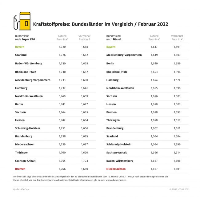 München (ots) – Während es deutschlandweit punktuell zu historischen Höchstständen an den Zapfsäulen kommt, gibt es zwischen den Bundesländern derzeit nur geringe Unterschiede. Der ADAC stellt in seinem Bundesländervergleich fest: Günstig ist es nirgendwo, am niedrigsten sind die Spritpreise bei der aktuellen Marktuntersuchung im Schnitt jedoch in Bayern. Mit nur zwei Cent zwischen dem teuersten…