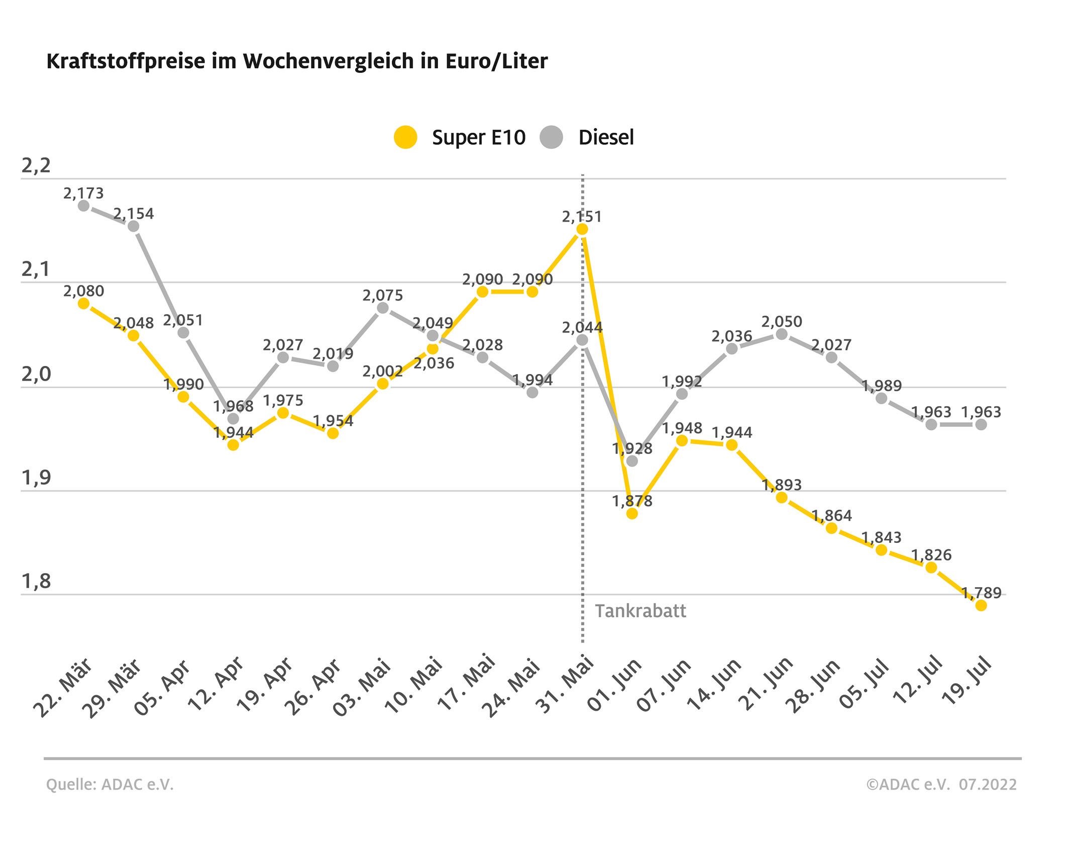 München (ots) – Leichte Entspannung beim Benzinpreis, keine Änderung bei Diesel! Die Preise der beiden Kraftstoffsorten entwickeln sich weiter auseinander. Die aktuelle ADAC Auswertung zeigt, dass ein Liter Super E10 im bundesweiten Mittel gegenüber der Vorwoche um 3,7 Cent billiger ist und aktuell 1,789 Euro kostet. Keine Änderung hingegen beim Diesel: Für einen Liter muss man derzeit an den deutschen Tankstellen im Schnitt 1,963 Euro bezahlen und damit exakt genauso viel wie vor Wochenfrist.