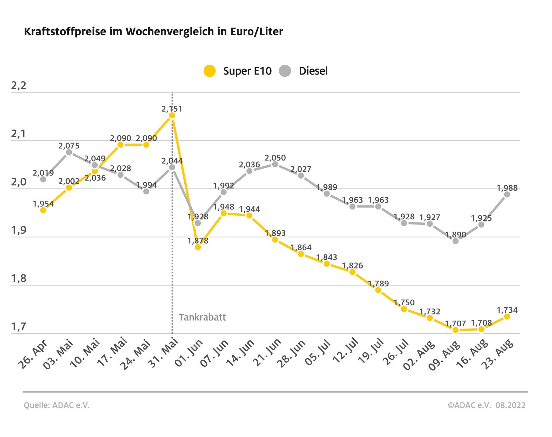 München (ots) – Eine Woche vor dem Auslaufen des Tankrabatts verzeichnet der ADAC im Wochenvergleich einen spürbaren Anstieg der Preise an den Zapfsäulen. Dies macht sich vor allem beim Diesel bemerkbar, der wieder an der Zwei-Euro-Grenze kratzt.