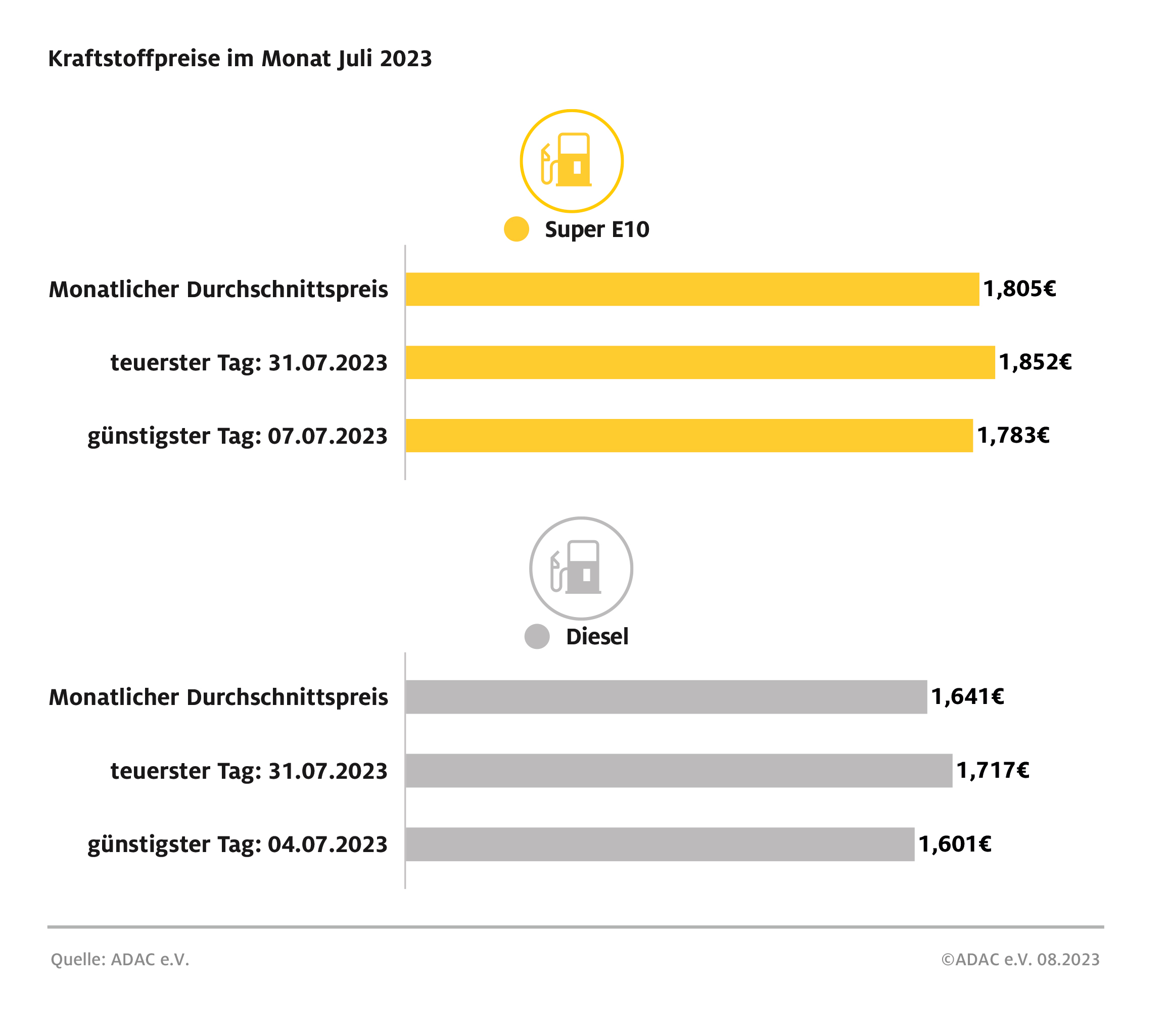 Geringer fiel der Preisanstieg bei Benzin aus. Teuerster Tag zum Tanken war ebenfalls der 31. Juli mit 1,852 Euro je Liter Super E10. Um 6,9 Cent günstiger war Super E10 noch am 7. Juli mit 1,783 Euro. Der letzte Tag des Monats war zugleich der teuerste Tag des Jahres bei Super E10.