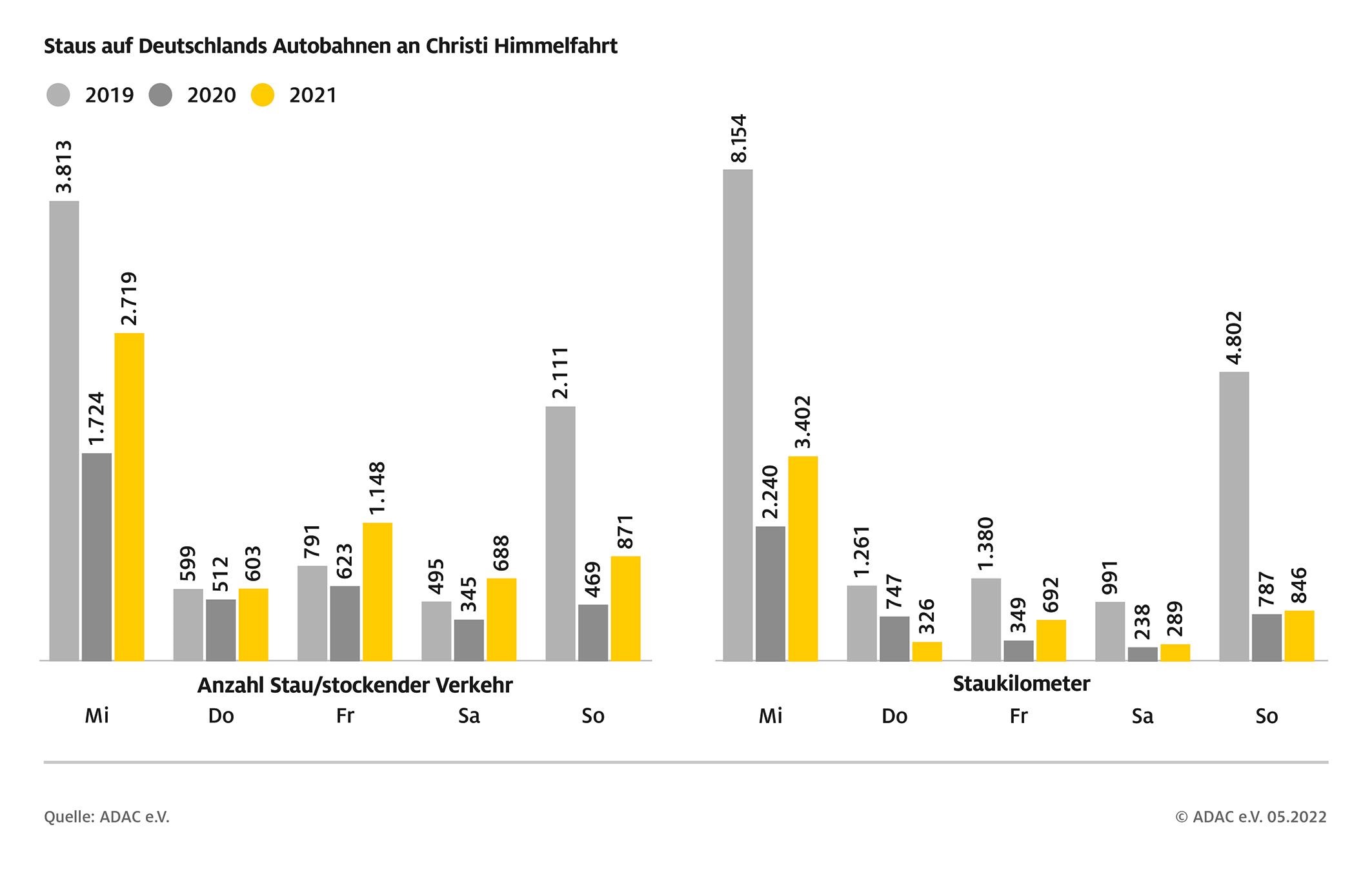 München (ots) – Autofahrerinnen und Autofahrer müssen am langen Christi-Himmelfahrts-Wochenende mit vielen Staus rechnen. Die Straßen dürften deutlich voller sein als an den Christi-Himmelfahrts-Wochenenden der beiden Vorjahre – die Corona-Krise schränkt den überregionalen Reiseverkehr nicht mehr ein. Vor allem die Autobahnen in den Ballungsräumen sind zeitweise sehr staugefährdet. An den mehr als 1000 Baustellen müssen Autofahrer ohnehin Geduld aufbringen.