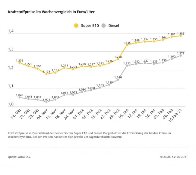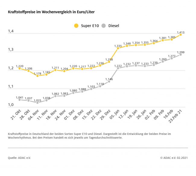 München (ots) Benzin und Diesel sind seit der vergangenen Woche deutlich teurer geworden – eine kräftige Verteuerung auf dem Rohölmarkt gibt es indes nicht. Wie die wöchentliche ADAC Auswertung der Kraftstoffpreise zeigt, kletterte der Preis für Superkraftstoff binnen Wochenfrist um 2,8 Cent je Liter. Damit kostet ein Liter Super E10 derzeit im bundesweiten Mittel 1,413…
