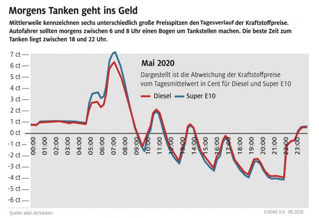 Sparpotenzial beim Tanken immer größer – ADAC Auswertung: Je nach Tageszeit unterscheiden sich die Preise um bis zu elf Cent – Teuerster Zeitpunkt morgens um 7 Uhr