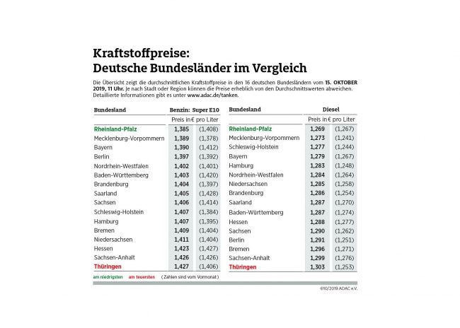 München (ots) Autofahrer in Thüringen und Sachsen-Anhalt müssen deutschlandweit derzeit die höchsten Preise für Kraftstoff bezahlen. Ein Liter Super E 10 kostet in Thüringen im Schnitt 1,427 Euro, für einen Liter Diesel sind 1,303 Euro fällig. In Sachsen-Anhalt, dem zweitteuersten Bundesland, liegt der Preis für Super E 10 bei 1,426 Euro und für Diesel bei 1,299…