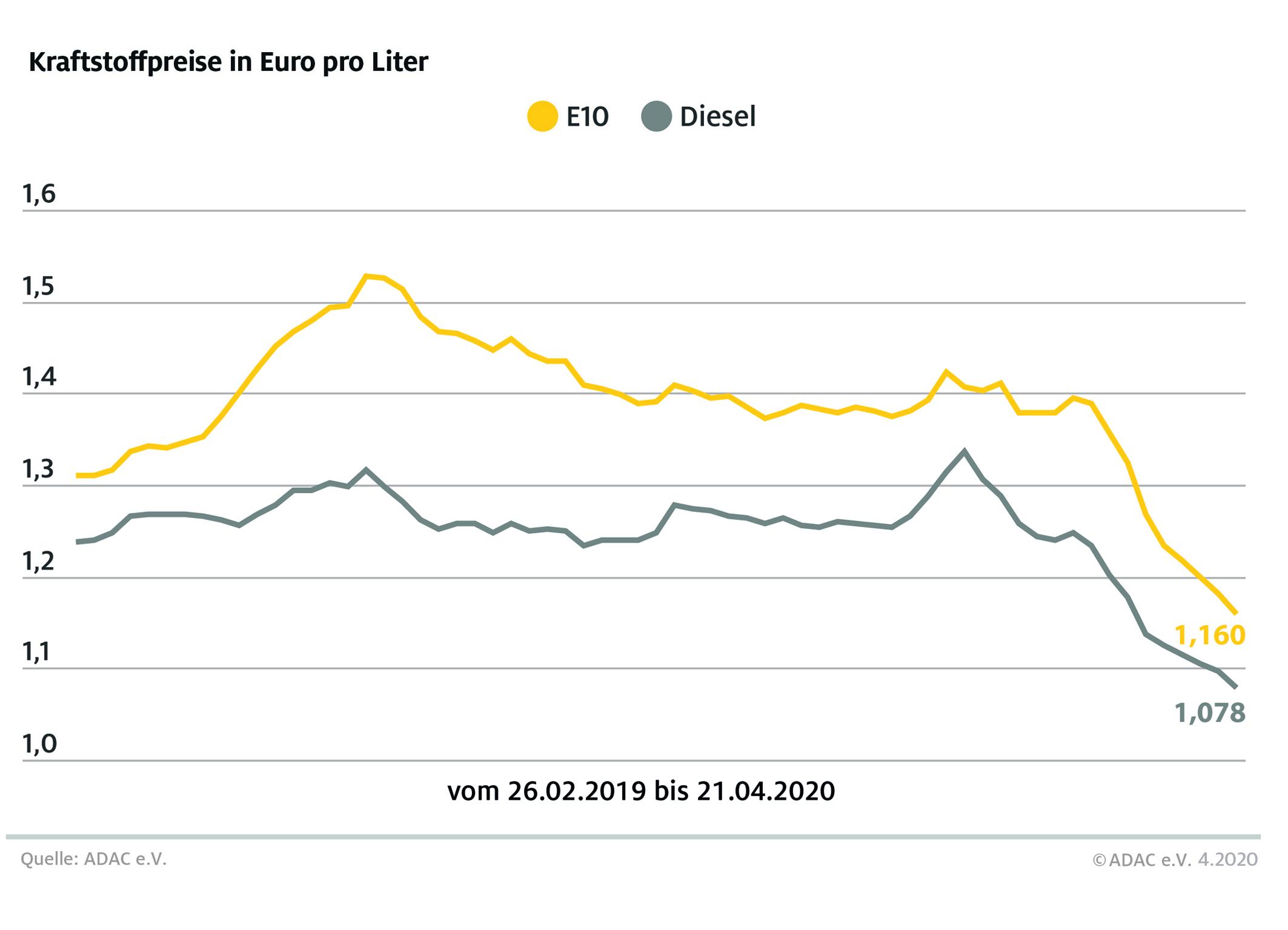München (ots) – Der Kraftstoffmarkt steht weiter ganz im Zeichen der Corona-Krise. Tanken ist im bundesweiten Durchschnitt bereits die neunte Woche in Folge billiger geworden. Laut aktueller Auswertung des ADAC müssen Autofahrer für einen Liter Super E10 im Bundesmittel 1,160 Euro bezahlen, das sind 2,1 Cent weniger als in der Vorwoche. Benzin ist damit so günstig wie zuletzt 2009.