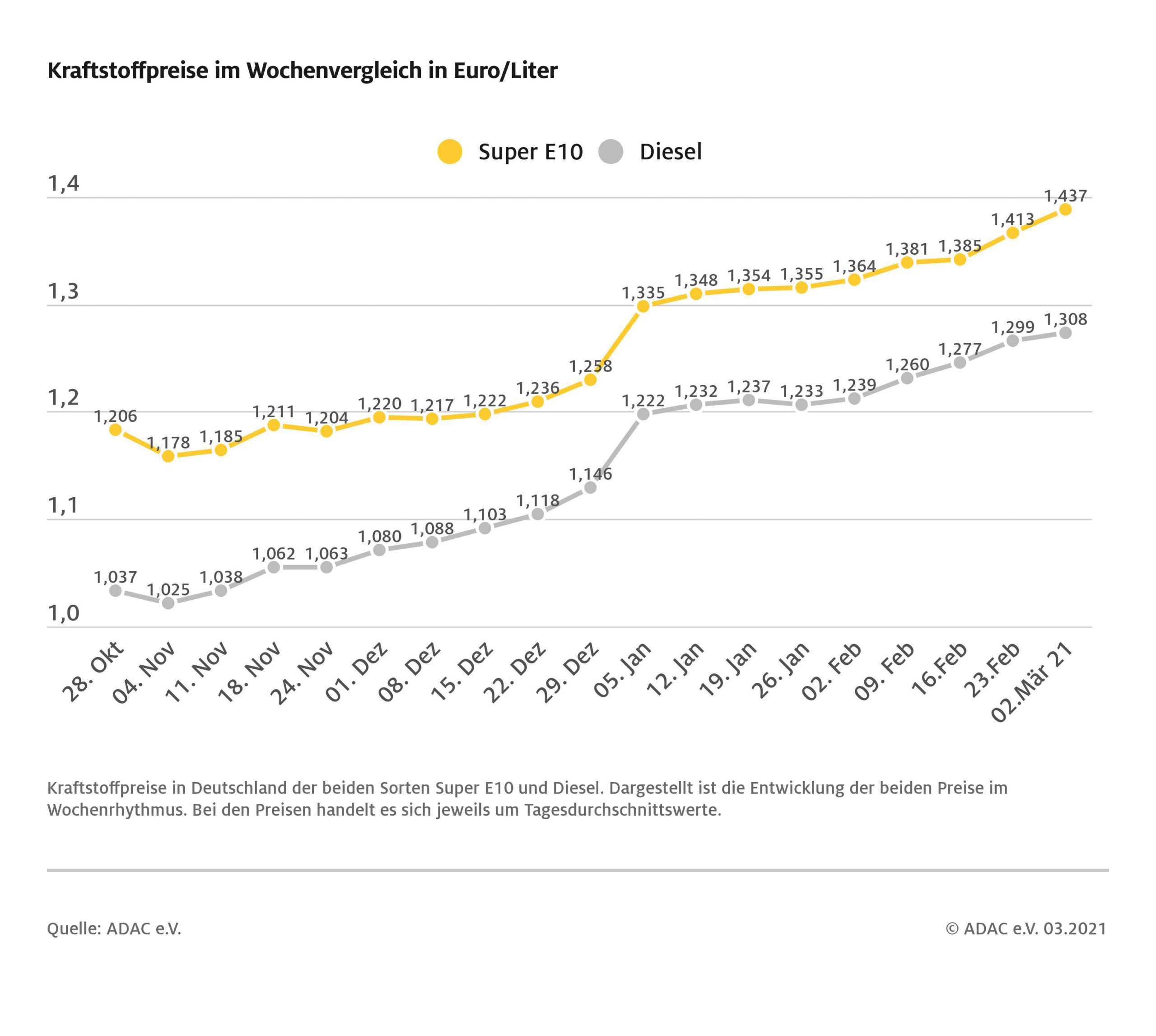 München (ots) – Die Kraftstoffpreise sind gegenüber der Vorwoche gestiegen. Wie der ADAC meldet, kostet ein Liter Super E10 im bundesweiten Mittel 1,437 Euro und damit 2,4 Cent mehr als vor einer Woche. Wie die wöchentliche Preisauswertung des ADAC weiter zeigt, fällt der Preisanstieg bei Diesel etwas schwächer aus: Für einen Liter müssen die Autofahrer derzeit 1,308 Euro bezahlen, das sind 0,9 Cent mehr. Zumindest was die größer gewordene Preisdifferenz zwischen den beiden Sorten betrifft, bedeutet die jüngste Preisentwicklung einen Schritt hin zu einer Normalisierung.