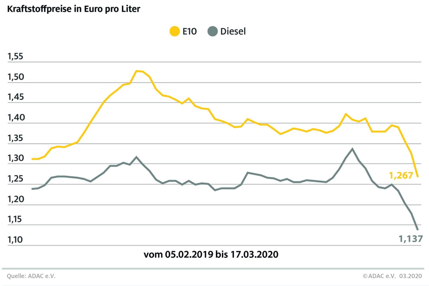 Angesichts der weltweiten Coronakrise und der einbrechenden Rohölnotierungen geben die Spritpreise an den Tankstellen deutlich nach. Laut aktueller Auswertung des ADAC kostet ein Liter Super E10 im Bundesmittel 1,267 Euro, das sind 5,8 Cent weniger als in der Vorwoche. Diesel verbilligte sich um 4,1 Cent auf durchschnittlich 1,137 Euro je Liter.