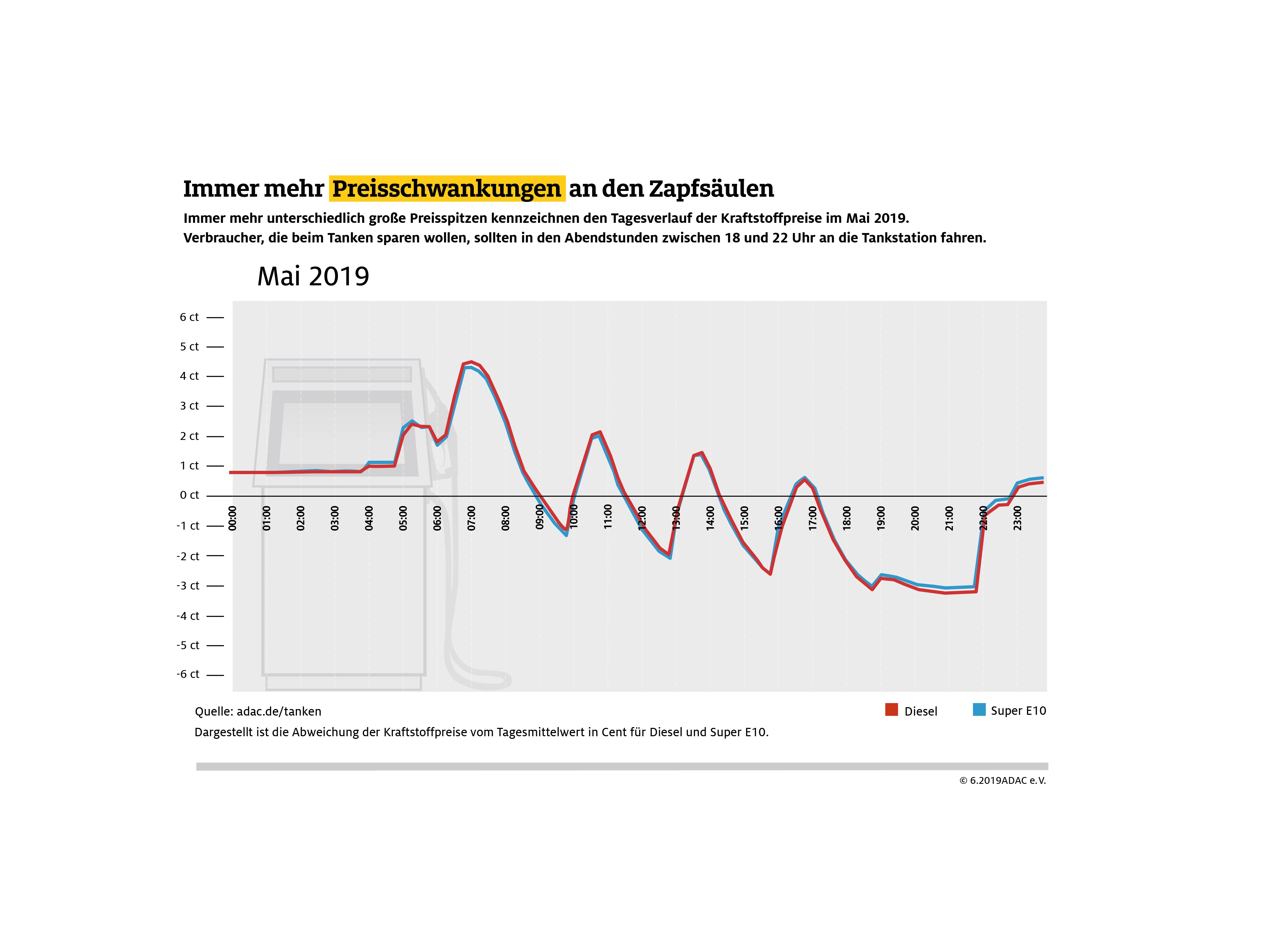 Immer häufiger ändern sich tagsüber die Spritpreise an den Tankstellen, immer undurchsichtiger und rätselhafter wirkt auf viele Autofahrer die Preisbildung an den Zapfsäulen. Licht ins Dunkel bringt jetzt eine aktuelle Untersuchung des ADAC: Danach ist Kraftstoff morgens zwischen 6 und 8 Uhr am teuersten. Am günstigsten ist Tanken zwischen 18 und 22 Uhr. Dazwischen sorgen drei Spitzen für zusätzliche Bewegung an den Preistafeln. Damit hat sich die Tagesverlaufskurve im Vergleich zu den Vorjahren erneut verändert, bislang gab es tagsüber nur zwei Preissprünge. Mittlerweile hat sich am Vormittag eine zusätzliche Preiserhöhung durchgesetzt. Basis der aktuellen Untersuchung waren sämtliche Preisbewegungen der gut 14.000 Tankstellen in Deutschland im Mai 2019.