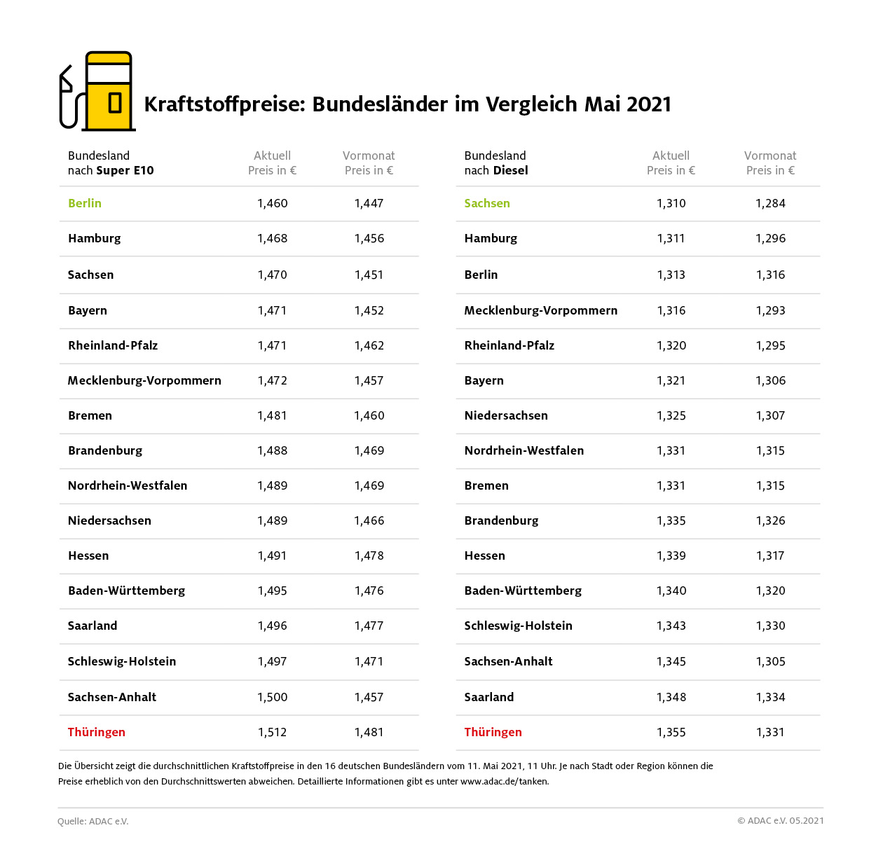 Günstig können sowohl Diesel als auch Benzin in Sachsen, Hamburg und Berlin getankt werden. Dieselfahrer zahlen in Sachsen nach der aktuellen ADAC Auswertung mit 1,310 Euro am wenigsten. Gefolgt von Hamburg mit 1,311 Euro pro Liter im Durchschnitt und Berlin (1,313 Euro). Wer Super E10 in Berlin tankt, zahlt derzeit mit durchschnittlich 1,460 Euro am wenigsten, wie bereits im Vormonat. Und auch in Hamburg (1,468) und Sachsen (1,470) müssen Fahrer von Benzinern nicht ganz so tief in die Tasche greifen.